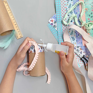 Cut the pattern decal sheet into pieces. Then, stick the decal onto the paper tube either vertically or horizontally. You can select and mix the patterns based on your preference and add ribbons and pom-pom ribbons for decoration. Finally, use silicone glue to attach the ribbons.