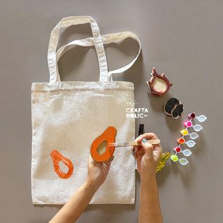 To apply color, use a brush to evenly spread acrylic paint onto the surface of the stamp as desired. Position the stamp on your chosen spot on the tote bag, then press down gently but firmly to transfer the color onto the canvas. Lift the stamp straight up to avoid smudging. You can use an acrylic marker to draw the seeds, segment lines, and outlines for the fruits, enhancing the printed shapes with a mix of colors and lines.